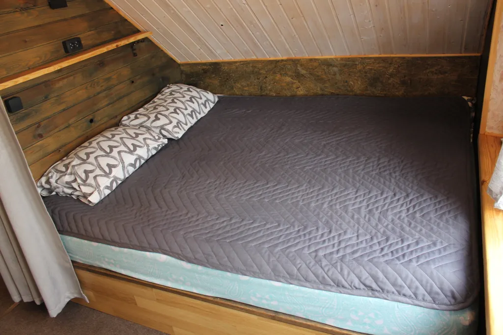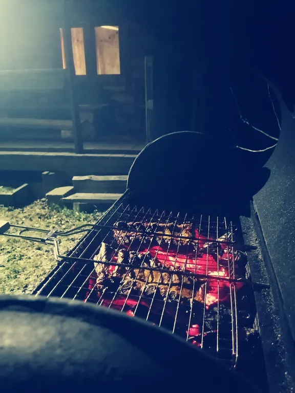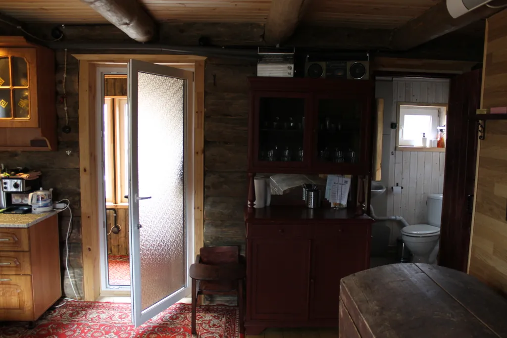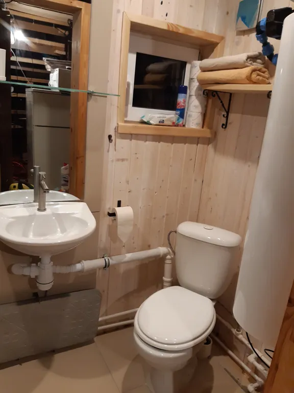 На первом этаже: в доме имеется кухня-гостиная с раскладывающим диваном (для 2-х человек), большой круглый обеденный стол, оборудованная кухня с индукционной плиткой, кофемашина, электрочайник, холодильник (компактный маленький), микроволновка. Также имеется совмещенная ванная комната с душевой кабиной и туалетом. Гостям предоставляются полотенца и постельное бельё.