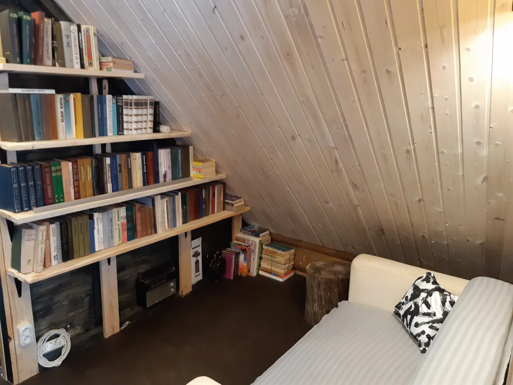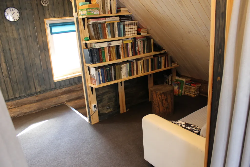 На втором этаже: в вашем распоряжении 1 спальня с двумя двуспальными кроватями, зоной отдыха с удобным диваном, для чтения книг или просто для релакса. Имеется небольшая библиотека.