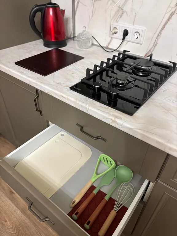 На полностью оборудованной кухне вас ждут: холодильник, микроволновая печь, газовая плита, чайник и полный набор посуды. Приготовьте любимые блюда и наслаждайтесь ими в уютной обстановке!
