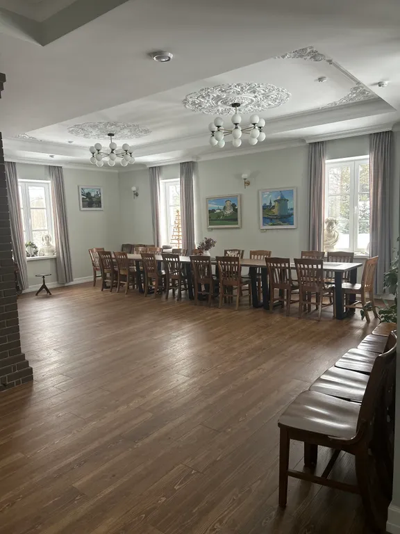 Просторный зал с камином — место, где можно согреться или просто наблюдать за игрой пламени. Вместимость зала — до 20 человек.